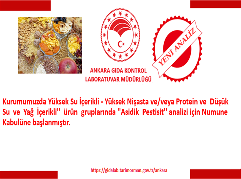 Kurumumuzda Yüksek Su İçerikli - Yüksek Nişasta ve/veya Protein ve Düşük Su ve Yağ İçerikli'' ürün gruplarında ''Asidik Pestisit'' analizi için Numune Kabulüne başlanmıştır.