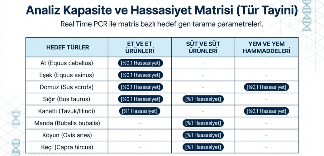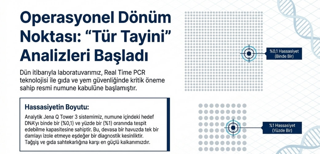 Laboratuvarımız Moleküler Biyoloji Analiz Birimi Et ve Et Ürünlerinde, Süt ve Süt Ürünlerinde, Yem ve Yem Hammaddelerinde Real Time PCR Yöntemi ile Tür Tayini analizleri için numune kabulüne başlamıştır.