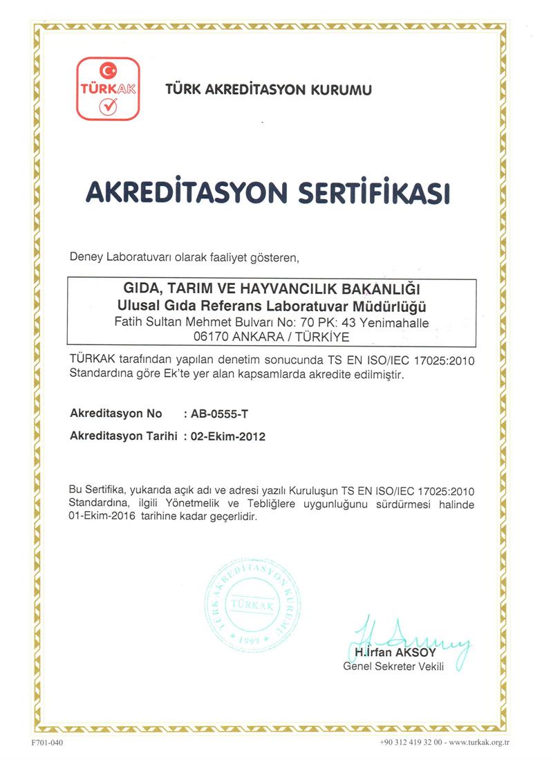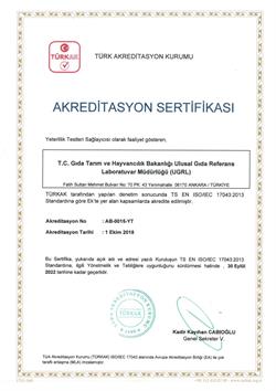 Kurumumuz Tarım ve Orman Bakanlığı Ulusal Gıda Referans Laboratuvar Müdürlüğü (UGRL), 2010 yılından beri sürdürmüş olduğu yeterlilik testi hizmeti ile ilgili olarak ‘TS EN ISO/IEC 17043 Uygunluk Değerlendirmesi-Yeterlilik Deneyi İçin Genel Şartlar’ standardına göre 01.10.2018 tarihinde TÜRKAK tarafından akredite olarak Türkiye’de gıda alanında akredite ilk ve tek yeterlilik test sağlayıcısı olmuştur.