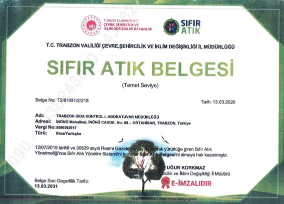 12.07.2019 tarihli ve 30829 sayılı Resmi Gazetede yayınlanarak yürürlüğe giren Sıfır Atık Yönetmeliği'nce Sıfır Atık Yönetim Sistemi'ni kurarak sıfır atık belgesini almaya hak kazanıştık.13.03.2026 tarihide Trabzon Valiliği Çevre Şehircilik ve İklim Değişikliği İl Müdürlüğü'nce Sıfır Atık Belgesi güncellenerek tarafımıza teslim edilmiştir.